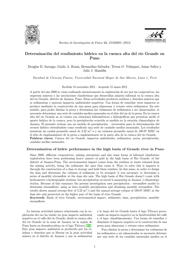Since 2000, dierent cooperatives, mining enterprises and also some forms of informal clandestine exploitation have been performing heavy minery of gold in the high basin of Rio Grande, of the district of Ananea-Puno. The environmental impact comes from the residues or waste released from the mining activity, being the sediments the ones that cause it. Ways to solve this is impacts is through the construction of a dam to storage and hold these residues. In this sense, in order to design the dam and determine the volumes of sediments to be storaged, it was necessary to determine a series of monthly streamow at the dam site axis. The high basin of Rio Grande doesnt count with hydrometric o hydrographic stations, but precipitation occurred is measuring at Ananea s climatology station. Because of this summary the present investigation uses precipitation - streamow model to determine streamows, using as data monthly precipitation and obtaining monthly streamow. The results shown annual average ow of 3.22 m3 /s and the annual average volume of 100.07 MMC at the dam site axis proyected on the higher part of the basin of river Grande. Keywords: Basin of river Grande, environmental impact, sediments, dam, precipitation, monthly streamows. La intensa actividad minera relacionada con la explotacin del oro ha tenido un gran impacto ambiental negativo en el valle del ro Grande, desde la cuenca alta del ro Grande en la zona de Ananea en la regin de Puno hasta su desembocadura en el lago Titicaca [1,2]. Este gran impacto ambiental es producido por los residuos y desechos que se liberan en la gran actividad minera en el distrito de Ananea y que se sedimentan 1 a lo largo del ro Grande hasta el lago Titicaca provocando un impacto negativo en la biodiversidad del valle y el lago, simultneamente. Una forma de remediar y disminuir el impacto negativo es la construccin de una presa para almacenar y retener estos sedimentos. Para disear la presa y determinar los volmenes de los sedimentos a ser almacenados es necesario determinar una serie de los caudales mensuales medios en el