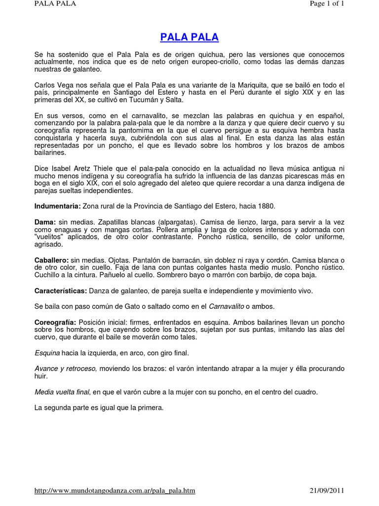 Se ha sostenido que el Pala Pala es de origen quichua, pero las versiones que conocemos actualmente, nos indica que es de neto origen europeo-criollo, como todas las dems danzas nuestras de galanteo. Carlos Vega nos seala que el Pala Pala es una variante de la Mariquita, que se bail en todo el pas, principalmente en Santiago del Estero y hasta en el Per durante el siglo XIX y en las primeras del XX, se cultiv en Tucumn y Salta. En sus versos, como en el carnavalito, se mezclan las palabras en quichua y en espaol, comenzando por la palabra pala-pala que le da nombre a la danza y que quiere decir cuervo y su coreografa representa la pantomima en la que el cuervo persigue a su esquiva hembra hasta conquistarla y hacerla suya, cubrindola con sus alas al final. En esta danza las alas estn representadas por un poncho, el que es llevado sobre los hombros y los brazos de ambos bailarines. Dice Isabel Aretz Thiele que el pala-pala conocido en la actualidad no lleva msica antigua ni mucho menos indgena y su coreografa ha sufrido la influencia de las danzas picarescas ms en boga en el siglo XIX, con el solo agregado del aleteo que quiere recordar a una danza indgena de parejas sueltas independientes. Indumentaria: Zona rural de la Provincia de Santiago del Estero, hacia 1880. Dama: sin medias. Zapatillas blancas (alpargatas). Camisa de lienzo, larga, para servir a la vez como enaguas y con mangas cortas. Pollera amplia y larga de colores intensos y adornada con "vuelitos" aplicados, de otro color contrastante. Poncho rstica, sencillo, de color uniforme, agrisado. Caballero: sin medias. Ojotas. Pantaln de barracn, sin doblez ni raya y cordn. Camisa blanca o de otro color, sin cuello. Faja de lana con puntas colgantes hasta medio muslo. Poncho rstico. Cuchillo a la cintura. Pauelo al cuello. Sombrero bayo o marrn con barbijo, de copa baja. Caractersticas: Danza de galanteo, de pareja suelta e independiente y movimiento vivo. Se baila con paso comn de Gato o saltado como en el Carnavalito o ambos. Coreografa: Posicin inicial: firmes, enfrentados en esquina. Ambos bailarines llevan un poncho sobre los hombros, que cayendo sobre los brazos, sujetan por sus puntas, imitando las alas del cuervo, que durante el baile se movern como tales. Esquina hacia la izquierda, en arco, con giro final. Avance y retroceso, moviendo los brazos: el varn intentando atrapar a la mujer y lla procurando huir. Media vuelta final, en que el varn cubre a la mujer con su poncho, en el centro del cuadro. La segunda parte es igual que la primera.