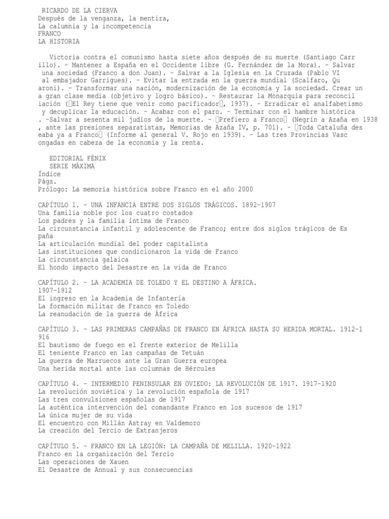 despus de su muerte (Santiago Carr illo). - Mantener a Espaa en el Occidente libre (G. Fernndez de la Mora). - Salvar una sociedad (Franco a don Juan). - Salvar a la Iglesia en la Cruzada (Pablo VI al embajador Garrigues). - Evitar la entrada en la guerra mundial (Scalfaro, Qu aroni). - Transformar una nacin, modernizacin de la economa y la sociedad. Crear un a gran clase media (objetivo y logro bsico). - Restaurar la Monarqua para reconcil iacin ( El Rey tiene que venir como pacificador , 1937). - Erradicar el analfabetismo y decuplicar la educacin. - Acabar con el paro. - Terminar con el hambre histrica . -Salvar a sesenta mil judos de la muerte. - Prefiero a Franco (Negrn a Azaa en 1938 , ante las presiones separatistas, Memorias de Azaa IV, p. 701). - Toda Catalua des eaba ya a Franco (Informe al general V. Rojo en 1939). - Las tres Provincias Vasc ongadas en cabeza de la economa y la renta. EDITORIAL FNIX SERIE MXIMA ndice Pgs. Prlogo: La memoria histrica sobre Franco en el ao 2000 CAPTULO 1. - UNA INFANCIA ENTRE DOS SIGLOS TRGICOS. 1892-1907 Una familia noble por los cuatro costados Los padres y la familia ntima de Franco La circunstancia infantil y adolescente de Franco; entre dos siglos trgicos de Es paa La articulacin mundial del poder capitalista Las instituciones que condicionaron la vida de Franco La circunstancia galaica El hondo impacto del Desastre en la vida de Franco CAPTULO 2. - LA ACADEMIA DE TOLEDO Y EL DESTINO A FRICA. 1907-1912 El ingreso en la Academia de Infantera La formacin militar de Franco en Toledo La reanudacin de la guerra de frica CAPTULO 3. - LAS PRIMERAS CAMPAAS DE FRANCO EN FRICA HASTA SU HERIDA MORTAL. 1912-1 916 El bautismo de fuego en el frente exterior de Melilla El teniente Franco en las campaas de Tetun La guerra de Marruecos ante la Gran Guerra europea Una herida mortal ante las columnas de Hrcules CAPTULO 4. - INTERMEDIO PENINSULAR EN OVIEDO: LA REVOLUCIN DE 1917. 1917-1920 La revolucin sovitica y la revolucin espaola de 1917 Las tres convulsiones espaolas de 1917 La autntica intervencin del comandante Franco en los sucesos de 1917 La nica mujer de su vida El encuentro con Milln Astray en Valdemoro La creacin del Tercio de Extranjeros CAPTULO 5. - FRANCO EN LA LEGIN: LA CAMPAA DE MELILLA. 1920-1922 Franco en la organizacin del Tercio Las operaciones de Xauen El Desastre de Annual y sus consecuencias