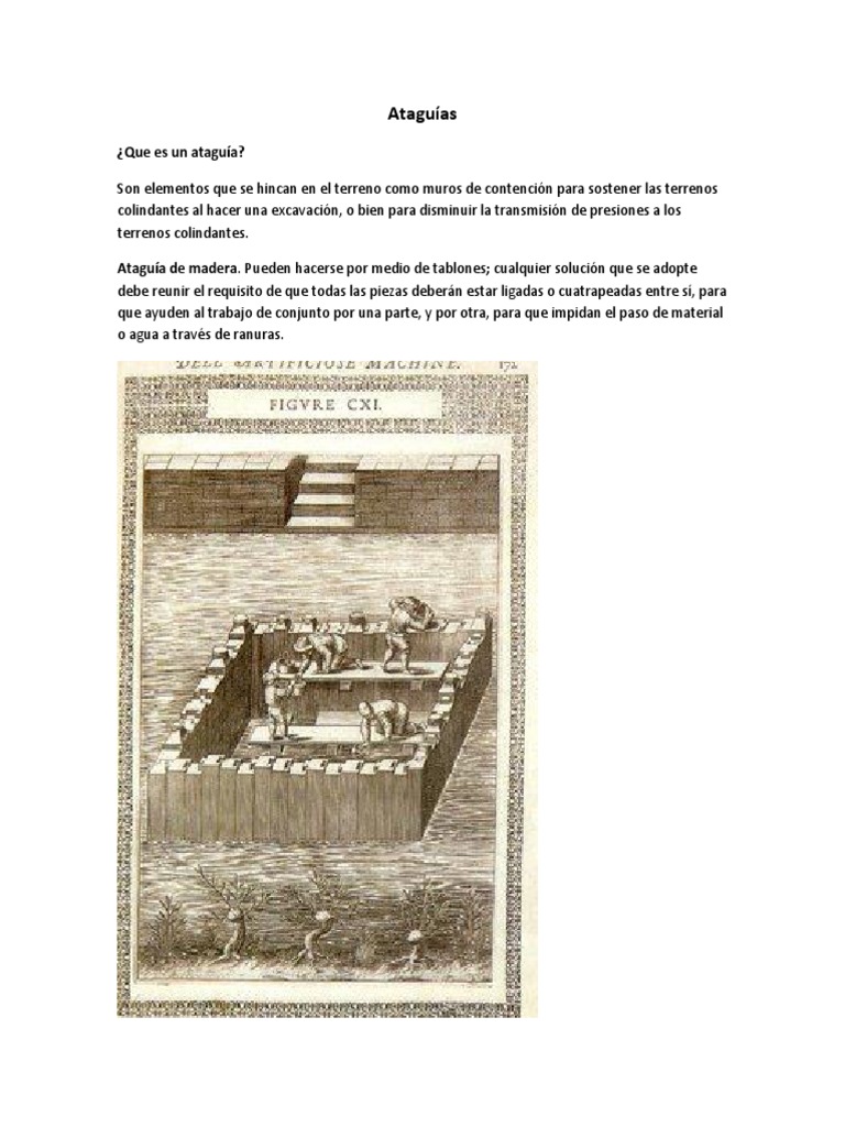 Que es un atagua? Son elementos que se hincan en el terreno como muros de contencin para sostener las terrenos colindantes al hacer una excavacin, o bien para disminuir la transmisin de presiones a los terrenos colindantes. Atagua de madera. Pueden hacerse por medio de tablones; cualquier solucin que se adopte debe reunir el requisito de que todas las piezas debern estar ligadas o cuatrapeadas entre s, para que ayuden al trabajo de conjunto por una parte, y por otra, para que impidan el paso de material o agua a travs de ranuras.