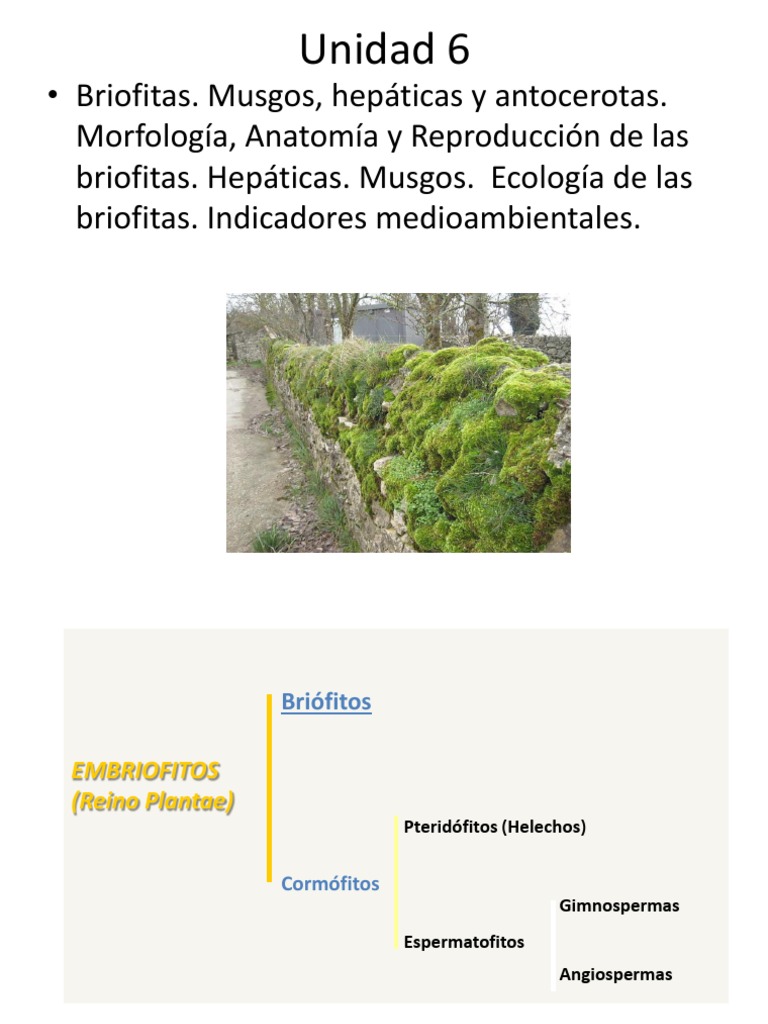 Briofitas. Musgos, hepticas y antocerotas. Morfologa, Anatoma y Reproduccin de las briofitas. Hepticas. Musgos. Ecologa de las briofitas.