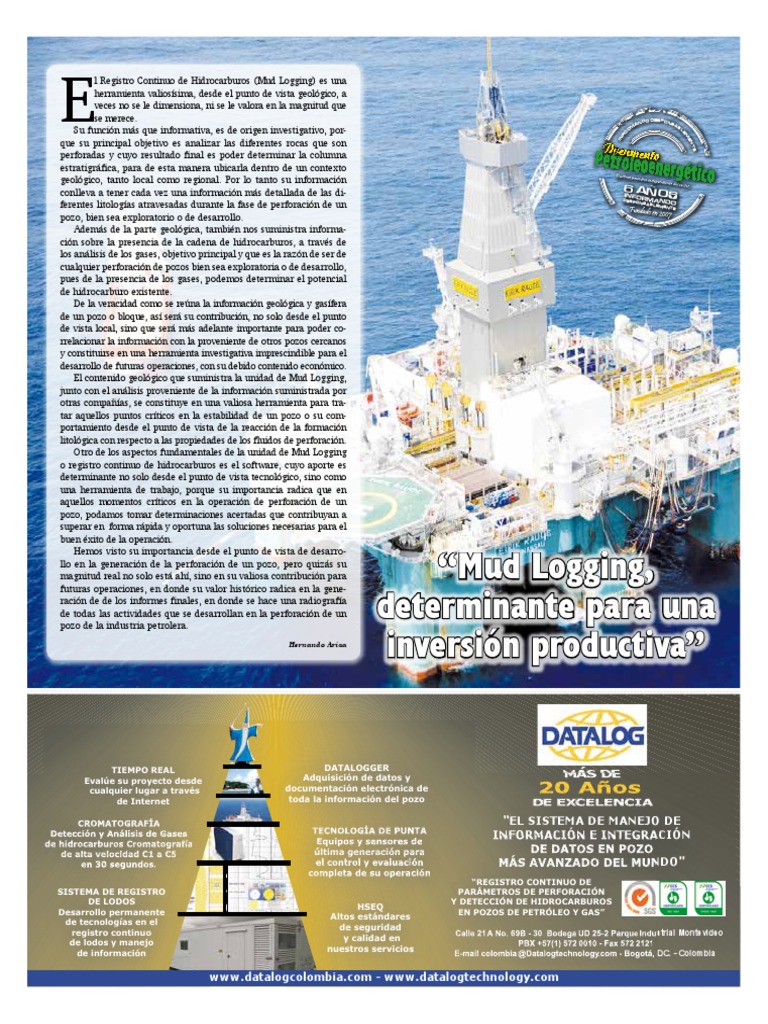 para tener una interpretacin confiable de la informacin recibida. Aqu no puede haber falla alguna, a pesar que la perforacin casi siempre tiene un grado de incertidumbre muy grande, esta se ha reducido con la incorporacin de equipos sofisticados de alta tecnologa y mejores prcticas de perforacin puntualiz Crdenas. Rompiendo paradigmas Hoy da la incertidumbre se ha reducido considerablemente, pues de los pozos exploratorios perforados son ms los exitosos, respecto a la proporcin de aos anteriores. Esto naturalmente es muy conveniente, sobre todo porque crea una dinmica mas gil en la actividad, mucho mas teniendo en cuenta que Colombia es un pas con petrleo, ms no es un pas petrolero. Datalog lleva 25 aos de labores en Colombia, actualmente tiene una nmina de 240 empleados y una capacidad para adelantar ms de 30 frentes de trabajo. Ecopetrol y las