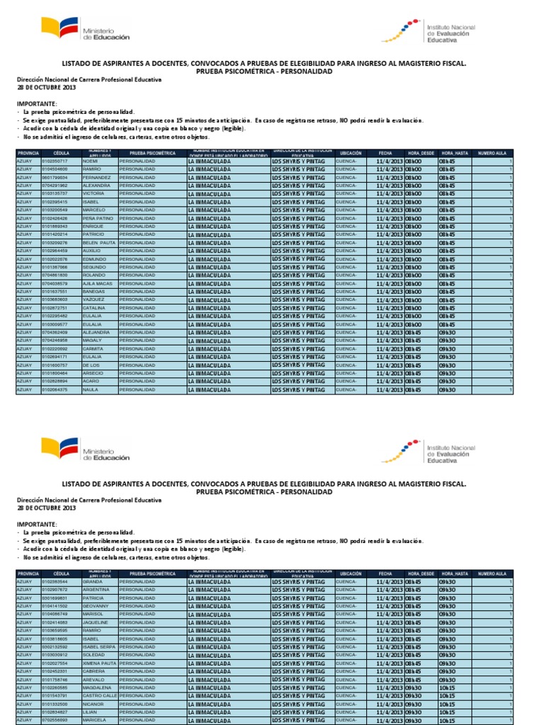 LISTADO DE ASPIRANTES A DOCENTES, CONVOCADOS A PRUEBAS DE ELEGIBILIDAD PARA INGRESO AL MAGISTERIO FISCAL. PRUEBA PSICOMTRICA - PERSONALIDAD