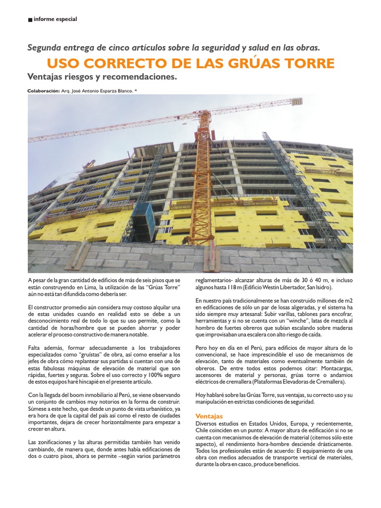reglamentarios- alcanzar alturas de ms de 30 40 m, e incluso algunos hasta 118 m (Edificio Westin Libertador, San Isidro). En nuestro pas tradicionalmente se han construido millones de m2 en edificaciones de slo un par de losas aligeradas, y el sistema ha sido siempre muy artesanal: Subir varillas, tablones para encofrar, herramientas y si no se cuenta con un winche, latas de mezcla al hombro de fuertes obreros que suban escalando sobre maderas que improvisaban una escalera con alto riesgo de cada. Pero hoy en da en el Per, para edificios de mayor altura de lo convencional, se hace imprescindible el uso de mecanismos de elevacin, tanto de materiales como eventualmente tambin de obreros. De entre todos estos podemos citar: Montacargas, ascensores de material y personas, gras torre o andamios elctricos de cremallera (Plataformas Elevadoras de Cremallera). Hoy hablar sobre las Gras Torre, sus ventajas, su correcto uso y su manipulacin en estrictas condiciones de seguridad.