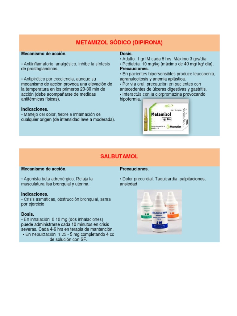 Mecanismo de accin. Antiinflamatorio, analgsico, inhibe la sntesis de prostaglandinas. Antipirtico por excelencia, aunque su mecanismo de accin provoca una elevacin de la temperatura en los primeros 20-30 min de accin (debe acompaarse de medidas antitrmicas fsicas). Indicaciones. Manejo del dolor, fiebre e inflamacin de cualquier origen (de intensidad leve a moderada). Dosis. Adulto: 1 gr IM cada 8 hrs. Mximo 3 grs/da. Pediatra: 10 mg/kg (mximo de 40 mg/ kg/ da). Precauciones. En pacientes hipersensibles produce leucopenia, agranulocitosis y anemia aplstica. Por va oral, precaucin en pacientes con antecedentes de lceras digestivas y gastritis. Interacta con la clorpromazina provocando hipotermia.