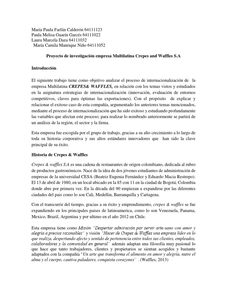 Camila Manrique Nio 64111052 Proyecto de investigacin empresa Multilatina Crepes and Waffles S.A Introduccin El siguiente trabajo tiene como objetivo analizar el proceso de internacionalizacin de la empresa Multilatina CREPES& WAFFLES, en relacin con los temas vistos y estudiados en la asignatura estrategias de internacionalizacin (innovacin, evaluacin de entornos competitivos, claves para ptimas las exportaciones). Con el propsito de explicar y relacionar el exitoso caso de esta compaa, argumentado los anteriores temas mencionados, mediante el proceso de internacionalizacin que ha sido exitoso y estudiando profundamente las variables que afectan este proceso; para realizar lo nombrado anteriormente se partir de un anlisis de la regin, el sector y la firma. Esta empresa fue escogida por el grupo de trabajo, gracias a su alto crecimiento a lo largo de toda su historia corporativa y sus altos estndares innovadores que han sido la clave principal de su xito. Historia de Crepes & Waffles Crepes & waffles S.A es una cadena de restaurantes de origen colombiano, dedicada al rubro de productos gastronmicos. Nace de la idea de dos jvenes estudiantes de administracin de empresas de la universidad CESA (Beatriz Eugenia Fernndez y Eduardo Macia Restrepo). El 13 de abril de 1980, en un local ubicado en la 85 con 11 en la ciudad de Bogot, Colombia donde abre por primera vez. En la dcada del 90 empiezan a expandirse por las diferentes ciudades del pais como lo son Cali, Medellin, Barranquilla y Cartagena. Con el transcurrir del tiempo, gracias a su xito y emprendimiento, crepes & waffles se fue expandiendo en los principales paises de latinoamerica, como lo son Venezuela, Panama, Mexico, Brazil, Argentina y por ultimo en el ao 2012 en Chile. Esta empresa tiene como Misin Despertar admiracin por servir arte-sano con amor y alegra a precios razonables y visin Hacer de Crepes & Waffles una empresa lder en lo que realiza, despertando afecto y sentido de pertenencia entre todos sus clientes, empleados, colaboradores y la comunidad en general adems adaptan una filosofa muy pasional lo que hace que tanto trabajadores, clientes y propietarios se sientan acogidos y bastante adaptados con la compaa Un arte que transforma el alimento en amor y alegra, nutre el alma y el cuerpo, cautiva paladares, conquista corazones . (Waffles, 2013)