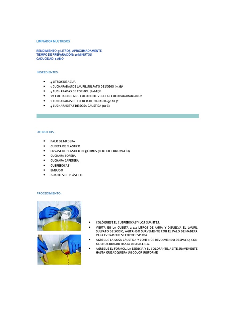 LIMPIADOR MULTIUSOS RENDIMIENTO: 5 LITROS, APROXIMADAMENTE TIEMPO DE PREPARACIN: 10 MINUTOS CADUCIDAD: 1 AO