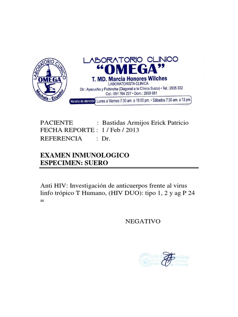 El informe médico de Erick Patricio Bastidas Armijos del 1 de febrero de 2013 incluye los resultados de un examen inmunológico. La prueba para detectar anticuerpos contra el VIH (tipos 1 y 2 y antígeno p24) dio negativo.