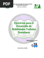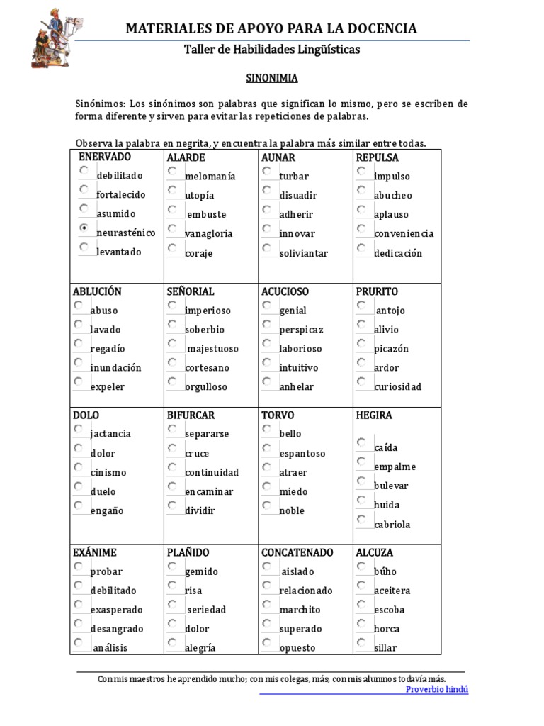 SINONIMIA Sinnimos: Los sinnimos son palabras que significan lo mismo, pero se escriben de forma diferente y sirven para evitar las repeticiones de palabras. Observa la palabra en negrita, y encuentra la palabra ms similar entre todas. ENERVADO ALARDE AUNAR REPULSA debilitado fortalecido asumido neurastnico levantado ABLUCIN abuso lavado regado inundacin expeler DOLO jactancia dolor cinismo duelo engao melomana utopa embuste vanagloria coraje SEORIAL imperioso soberbio majestuoso cortesano orgulloso BIFURCAR separarse cruce continuidad encaminar dividir turbar disuadir adherir innovar soliviantar ACUCIOSO genial perspicaz laborioso intuitivo anhelar TORVO bello espantoso atraer miedo noble cada empalme bulevar huida cabriola EXNIME probar debilitado exasperado desangrado anlisis PLAIDO gemido risa seriedad dolor alegra CONCATENADO aislado relacionado marchito superado opuesto ALCUZA bho aceitera escoba horca sillar impulso abucheo aplauso conveniencia dedicacin PRURITO antojo alivio picazn ardor curiosidad HEGIRA