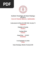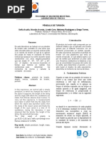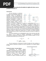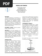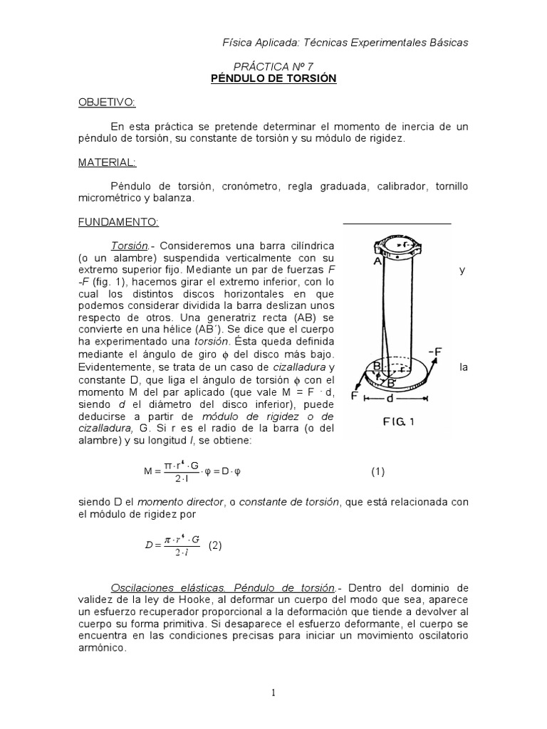 de un pndulo de torsin, su constante de torsin y su mdulo de rigidez. !TE"I!#: $ndulo de torsin, cronmetro, regla graduada, cali%rador, tornillo micromtrico y %alanza. &'()! E(TO: T rsi!n"# *onsideremos una %arra cil+ndrica ,o un alam%re- suspendida .erticalmente con su e/tremo superior 0i1o. ediante un par de 0uerzas F #F ,0ig. 2-, 3acemos girar el e/tremo in0erior, con lo cual los distintos discos 3orizontales en 4ue podemos considerar [Link] la %arra deslizan unos respecto de otros. 'na generatriz recta ,!B- se [Link] en una 3lice ,!B5-. 6e dice 4ue el cuerpo 3a e/perimentado una t rsi!n. 7sta 4ueda de0inida mediante el ngulo de giro del disco ms %a1o. [Link], se trata de un caso de ci$allad%ra y constante ), 4ue liga el ngulo de torsin con el momento del par aplicado ,4ue .ale 8 & . d, siendo d el dimetro del disco in0erior-, puede deducirse a partir de m!d%l de ri&ide$ de ci$allad%ra' 9. 6i r es el radio de la %arra ,o del alam%re- y su longitud l, se o%tiene: