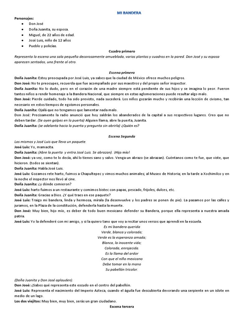 icas. Cuadro primero Representa la escena una sala pequea decorosamente amueblada, varias plantas y cuadros en la pared. Don Jos y su esposa aparecen sentados, uno frente al otro. Escena primera Doa Juanita: Estoy preocupada por Jos Luis, ya sabes que la ciudad de Mxico ofrece muchos peligros. Don Jos: No te preocupes, recuerda que fue acompaado por sus maestros y del propio seor inspector. Doa Juanita: No lo dudo, pero en el corazn de una madre siempre est pendiente de sus hijos y se imagina lo peor. Fueron tantos nios a rendir homenaje a la Bandera Nacional, que siempre en estas aglomeraciones puede resultar algo malo. Don Jos: Pierde cuidado, todo ha sido previsto, nada suceder. Los nios gozarn mucho y recibirn una leccin de civismo, tan necesario en estos tiempos de egosmos personales. Doa Juanita: Ojal que no tengamos que lamentar nada malo. Don Jos: Precisamente la radio anunci que hoy saldrn los abanderados de la capital a sus respectivos lugares. Creo que no deben tardar. (Se oyen golpes en la puerta) Alguien llama, abre la puerta, Juanita. Doa Juanita: (se adelanta hacia la puerta y pregunta sin abrirla) Quin es? Escena Segunda Los mismos y Jos Luis que lleva un paquete. Jos Luis: Yo, mamacita. Doa Juanita: (Abre la puerta y entra Jos Luis. Se abrazan). Hijo mo! Don Jos: ya vez, como te lo deca, ah lo tienes sano y salvo. Venga un abrazo (se abrazan). Cuntanos como te fue, que viste, que hicieron. (todos se sientan). Doa Juanita: Habla Jos Luis. Jos Luis: Gozamos rete harto, fuimos a Chapultepec y vimos muchos animales; al Museo de Historia; en la tarde a Xochimilco y en la noche el inspector nos llev al cine. Doa Juanita: y dnde comieron? Jos Luis: harto fuimos a un restaurante y comimos bistec con papas, pescado, frijoles, dulces, etc. Doa Juanita: Gracias a Dios. Y qu traes en ese paquete? Jos Luis: Traigo mi bandera, linda y hermosa, mrala (la desenvuelve y los padres se ponen de pie). La pasamos por las calles y juramos, en la Plaza de la constitucin, defenderla hasta la muerte. Don Jos: Muy bien, hijo mo, es deber de todo buen mexicano defender su Bandera, porque ella representa a nuestra amada patria. Jos Luis: Yo la defender con mi amigo, y si la quiero tano que voy a recitar unos versos que aprend en la escuela. Es mi bandera querida Verde, blanca y colorada; Verde es la esperanza amada; Blanca, la inocente vida; Colorada, enrojecida. Es la llama del ardor Con que el nio mexicano Debe tomar en la mano Su pabelln tricolor. (Doa Juanita y Don Jos aplauden). Don Jos: Sabes qu representa este escudo en el centro del pabelln. Jos Luis: Representa el nacimiento del Imperio Azteca, cuando el guila fue descubierta devorando una serpiente en un islote en medio de un lago. Los dos viejitos: Muy bien, muy bien, sers un gran ciudadano. Escena tercera