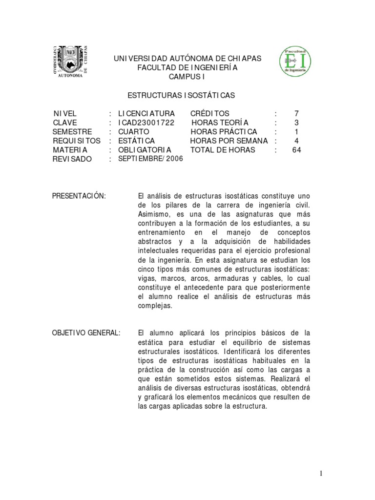 UNIVERSIDAD AUTNOMA DE CHIAPAS FACULTAD DE INGENIERA CAMPUS I ESTRUCTURAS ISOSTTICAS NIVEL CLAVE SEMESTRE REQUISITOS MATERIA REVISADO : : : : : : LICENCIATURA