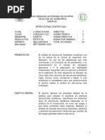 Definicin de estructura 1.1.1 Componentes de un sistema estructural 1.1.2 Clasificacin de las estructuras segn el material, el sistema de referencia y su geometra Grado de hiperestaticidad en el plano y en espacio Grado de libertad en el plano y en espacio Tipos de cargas 1.4.1 Cargas muertas 1.4.2 Cargas vivas 1.4.3 Cargas accidentales Modelacin de cargas TIEMPO ESTIMADO: TERICO: PRCTICO: SUBTOTAL: 6 3 9 Hrs. Hrs. Hrs.