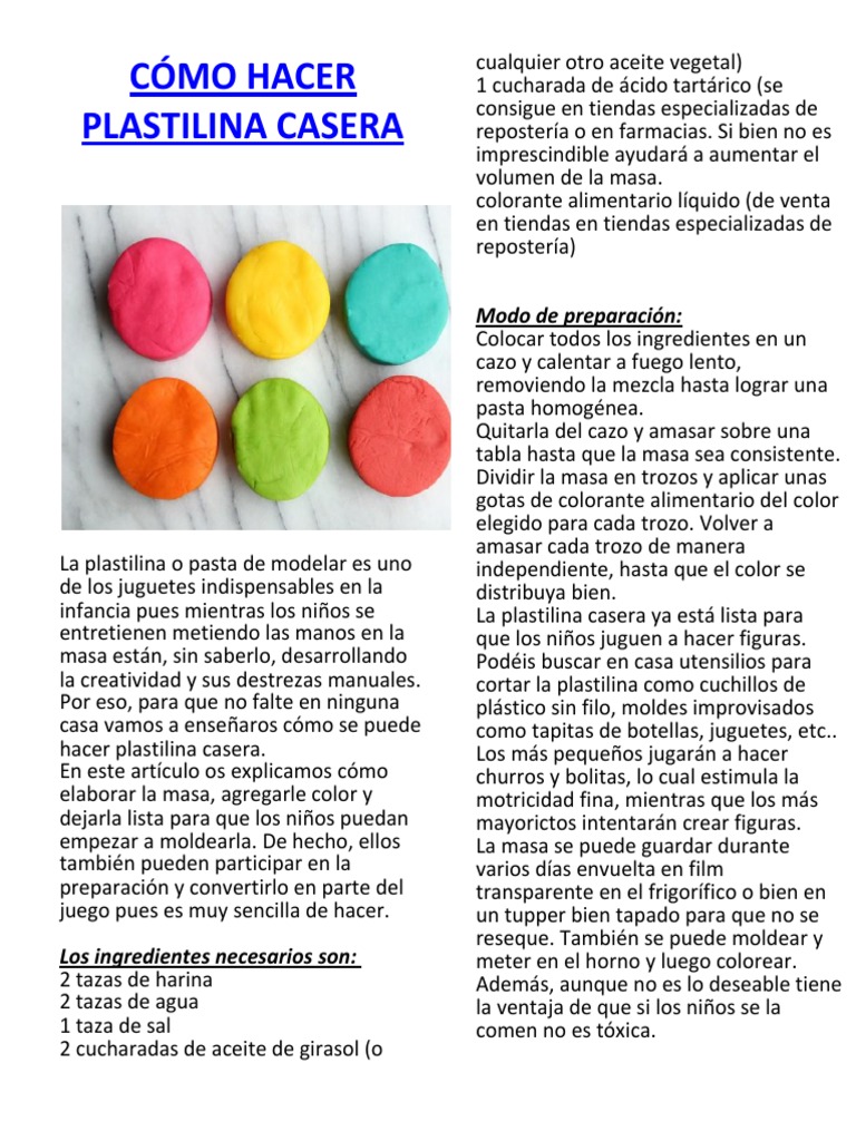 cualquier otro aceite vegetal) 1 cucharada de cido tartrico (se consigue en tiendas especializadas de repostera o en farmacias. Si bien no es imprescindible ayudar a aumentar el volumen de la masa. colorante alimentario lquido (de venta en tiendas en tiendas especializadas de repostera) Modo de preparacin: Colocar todos los ingredientes en un cazo y calentar a fuego lento, removiendo la mezcla hasta lograr una pasta homognea. Quitarla del cazo y amasar sobre una tabla hasta que la masa sea consistente. Dividir la masa en trozos y aplicar unas gotas de colorante alimentario del color elegido para cada trozo. Volver a amasar cada trozo de manera independiente, hasta que el color se distribuya bien. La plastilina casera ya est lista para que los nios juguen a hacer figuras. Podis buscar en casa utensilios para cortar la plastilina como cuchillos de plstico sin filo, moldes improvisados como tapitas de botellas, juguetes, etc.. Los ms pequeos jugarn a hacer churros y bolitas, lo cual estimula la motricidad fina, mientras que los ms mayorictos intentarn crear figuras. La masa se puede guardar durante varios das envuelta en film transparente en el frigorfico o bien en un tupper bien tapado para que no se reseque. Tambin se puede moldear y meter en el horno y luego colorear. Adems, aunque no es lo deseable tiene la ventaja de que si los nios se la comen no es txica.