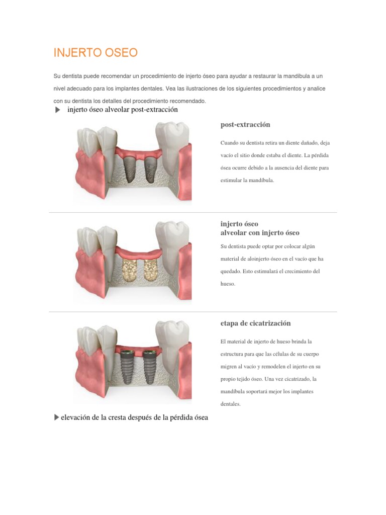 El material de injerto de hueso brinda la estructura para que las clulas de su cuerpo migren al vaco y remodelen el injerto en su propio tejido seo. Una vez cicatrizado, la mandbula soportar mejor los implantes dentales.