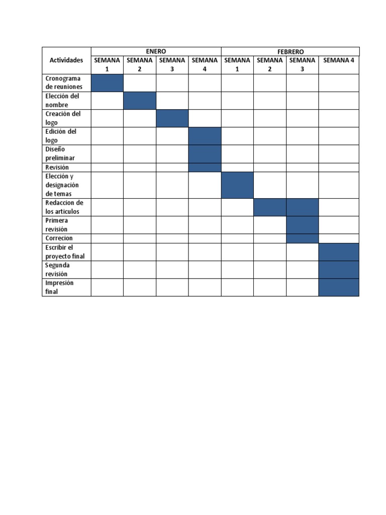 Actividades Cronograma de reuniones Eleccin del nombre Creacin del logo Edicin del logo Diseo preliminar Revisin Eleccin y designacin de temas Redaccion de los articulos Primera revisin Correcion Escribir el proyecto final Segunda revisin Impresin final