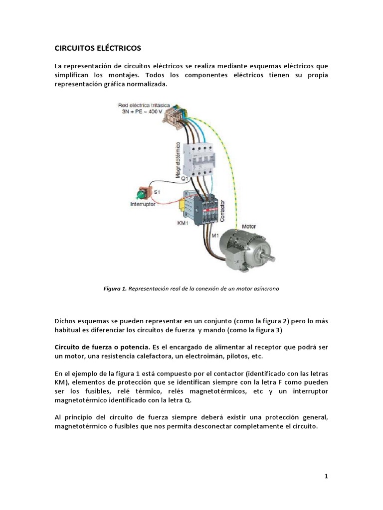 Dichosesquemassepuedenrepresentarenunconjunto(comolafigura2)peroloms habitualesdiferenciarloscircuitosdefuerzaymando(comolafigura3) Circuito de fuerza o potencia. Es el encargado de alimentar al receptor que podr ser unmotor,unaresistenciacalefactora,unelectroimn,pilotos,etc. Enelejemplodelafigura1estcompuestoporelcontactor(identificadoconlasletras KM), elementos de proteccin que se identifican siempre con la letra F como pueden ser los fusibles, rel trmico, rels magnetotrmicos, etc y un interruptor magnetotrmicoidentificadoconlaletraQ. Al principio del circuito de fuerza siempre deber existir una proteccin general, magnetotrmicoofusiblesquenospermitadesconectarcompletamenteelcircuito.