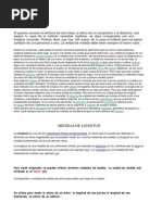 longitud) estaban de cierto lugar, es decir, han tenido una unidad para medir distancias: una unidad de longitud. En los primeros tiempos el cuerpo humano fue la medida ms conveniente. As los primeros pueblos usaron la longitud de un paso, la anchura de un dedo o de una mano, la longitud del antebrazo, la distancia recorrida en un da de viaje, la distancia a la cual caa una flecha luego de ser disparada, entre otros mtodos. Luego, para irrigar y cultivar la tierra, lleg a ser necesario medirla, para lo cual se usaron varas de determinada longitud y forma. Posteriormente, con el advenimiento de las construcciones de piedra, en las pocas de los grandes reinos de Egipto y Babilonia, se us como unidad de medida el "codo"; la distancia desde el codo hasta el dedo medio de la mano. Pero dado que esta medida variaba de persona a persona, el llamado codo maestro de granito negro, con el cual se comparaban y calibraban todas las varas de codo de Egipto. De esta manera se estableci una de la primera medida patrn. Para elaborar mapas, en tiempos de los Ptolomeos, existeron hombres que recorran a pie los caminos y contaban en unidades llamadas "estadios". Contaban cuntos pasos iguales tenan que dar para medir una distancia. Cada uno de esos mtodos era una unidad de longitud. En este trabajo monogrfico destaco que Cuando medimos la longitud de un objeto, estamos viendo cuantas veces entra una unidad de medida en el largo del objeto. Para que todos obtengamos el mismo resultado debemos usar la misma unidad de medida. Para ello se cre una unidad principal de longitud llamada metro que es fija, universal e invariable. El sistema de unidades de medida que incluye al metro junto a sus mltiplos y submltiplos se llama Sistema Mtrico Decimal. En la Rama de las matemticas que se ocupa de las propiedades del espacio. En su forma ms elemental, la geometra se preocupa de problemas mtricos como el clculo del rea y dimetro de figuras planas y de la superficie y volumen de cuerpos slidos. Otros campos de la geometra son la geometra analtica, geometra descriptiva, topologa, geometra de espacios y otros. Cabe destacar que las unidades de medidas es fundamental para la vida cotidiana del hombre. Medidas de longitud El metro, el decmetro, el centmetro y el milmetro Para medir un objeto se utiliza el metro. Si se desea medir objetos ms pequeos necesitamos otras unidades de medida menores, como son: El decmetro: Que se obtiene al dividir el metro en diez partes iguales. El centmetro: Se obtiene al dividir el decmetro en diez partes iguales. El milmetro: Se obtiene al dividir el centmetro en diez partes iguales. El metro: Es la unidad principal de medida de longitud. Abreviadamente se expresa as: 1 metro = 1 m El decmetro, el centmetro y el milmetro son unidades que se utilizan para medir longitudes ms pequeas que el metro. 1 metro = 10 decmetros 1 m = 10 dm 1 decmetro = 10 centmetros 1 dm = 10 cm 1 centmetro = 10 milmetros 1 cm = 10 mm