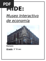 el precio inicial al precio final, hasta la forma en que llega a todos y cado uno de nosotros y de los productos y servicios que utilizamos cotidianamente y como aumenta su precio de esto ao con ao El museo interactivo de economa (MIDE) se encuentra ubicado en el centro histrico de la ciudad de Mxico, est formado por 4 pisos principales los cuales nos muestran de manera interactiva informacin acerca de la economa de Mxico, haciendo comparacin con otros pases y todo lo que sta involucra. Nos muestran las formas en que la economa se encuentra en nuestra vida diaria, como en el hogar, en el trabajo y en todas las acciones que realizamos para sobrevivir y relacionarnos como sociedad. Por ejemplo en el 4to. piso nos habla acerca del desarrollo sustentable y se dan ejemplos de cmo afecta a nuestro planeta adems de las grandes desventajas que se generan a partir de la produccin, distribucin y consumo de diversos bienes y servicios. Siempre se debe de buscar un balance entre las decisiones econmicas, el bienestar de la sociedad y el cuidado del planeta. La mejor forma de preservar el planeta es reciclando y reduciendo el consumo, ahorrar y reutilizar el agua, reducir produccin de desechos etc, con estas acciones estaremos contribuyendo a una ciudad sustentable En el tercer piso se presentan principios bsicos de la economa; el movimiento de la economa, cmo funciona la oferta y la demanda, la escasez, los efecto de la inflacin, partes fundamentales para que el comercio se lleve a cabo, diferentes tipos de produccin, venta de servicios y productos, la numismtica en Mxico, diseo y produccin de billetes y monedas, lo que Mxico exporta, el trueque etc. Una de las actividades que se pueden realizar es una actividad denominada simulador de mercado, donde se observar el comportamiento del mercado tanto en el lado de la oferta como demanda; esto consiste en formar equipos de 10 personas aproximadamente, distinguidos con algunos chalecos de color naranja y azul. Los chicos que portaban el chaleco azul representaran un vendedor y los de chaleco naranja representaran a los compradores, el instructor sealo que debamos hacer una compra de tal forma que pudiramos ver cmo se maneja esto en la vida cotidiana. Esto se realizo en 3 rondas para observa las graficas, esto quiere decir, una idea del comportamiento realizado en el ejercicio. En los pisos restantes se puede ver cmo es que la economa influye hasta en los objetos que podemos ver a nuestro alrededor. Se observa que existe una gran importancia en las inversiones dentro del gobierno, su manejo, funcin y finalidad