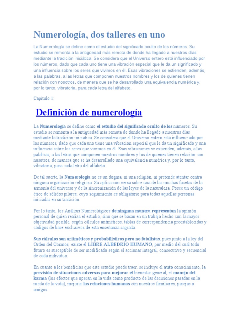 La Numerologa se define como el estudio del significado oculto de los nmeros. Su estudio se remonta a la antigedad ms remota de donde ha llegado a nuestros das mediante la tradicin inicitica. Se considera que el Universo entero est influenciado por los nmeros, dado que cada uno tiene una vi racin especial que le da un significado ! una influencia so re los seres que vivimos en "l. #sas vi raciones se e$tienden, adems, a las pala ras, a las letras que componen nuestros nom res ! los de quienes tienen relacin con nosotros, de manera que se ha desarrollado una equivalencia num"rica !, por lo tanto, vi ratoria, para cada letra del alfa eto.