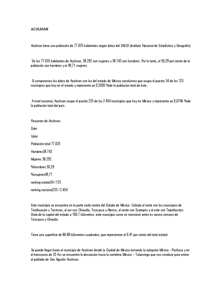 Resumen de Acolman: Dato Valor Poblacin total 77.035 Hombres38.743 Mujeres 38.292 % hombres 50,29 % mujeres49,71 ranking estatal34 / 125 ranking nacional235 / 2.454