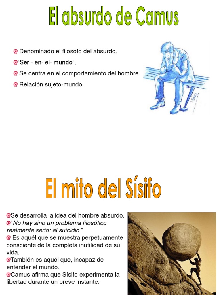 Se desarrolla la idea del hombre absurdo. No hay sino un problema filosfico realmente serio: el suicidio. Es aqul que se muestra perpetuamente consciente de la completa inutilidad de su vida. Tambin es aqul que, incapaz de entender el mundo. Camus afirma que Ssifo experimenta la libertad durante un breve instante.