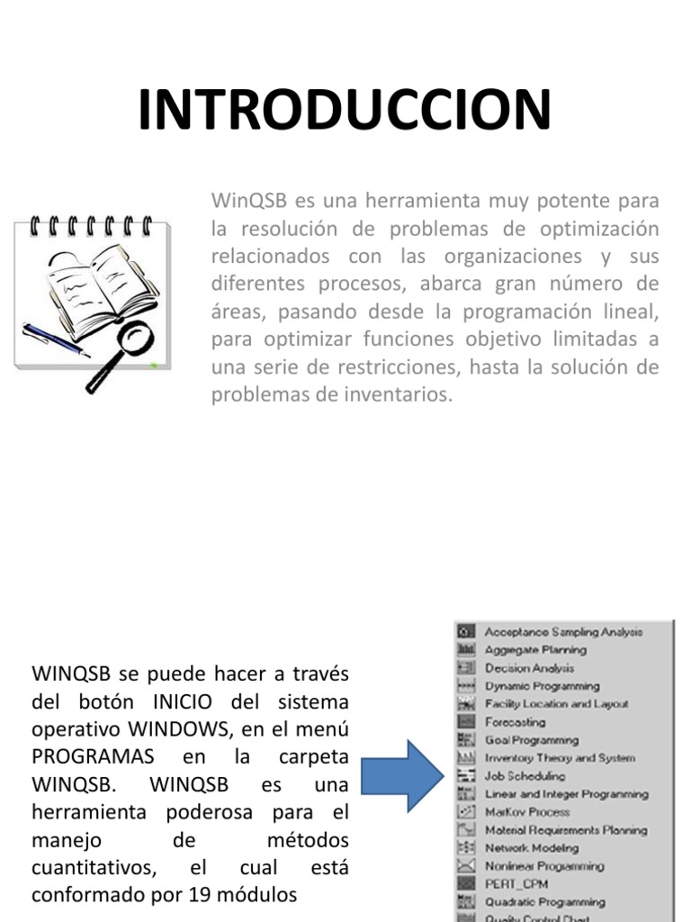WINQSB se puede hacer a travs del botn INICIO del sistema operativo WINDOWS, en el men PROGRAMAS en la carpeta WINQSB. WINQSB es una herramienta poderosa para el manejo de mtodos cuantitativos, el cual est conformado por 19 mdulos