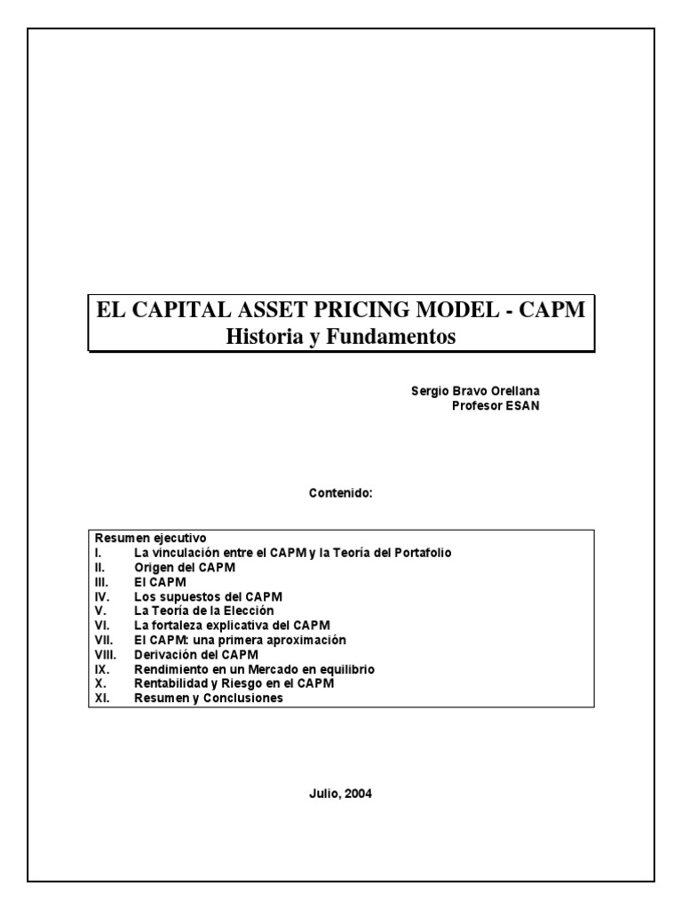 Contenido: Resumen ejecutivo I. La vinculacin entre el CAPM y la Teora del Portafolio II. Origen del CAPM III. El CAPM IV. Los supuestos del CAPM V. La Teora de la Eleccin VI. La fortaleza explicativa del CAPM VII. El CAPM: una primera aproximacin VIII. Derivacin del CAPM IX. Rendimiento en un Mercado en equilibrio X. Rentabilidad y Riesgo en el CAPM XI. Resumen y Conclusiones