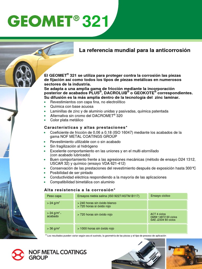 El GEOMET 321 se utiliza para proteger contra la corrosin las piezas de fijacin as como todos los tipos de piezas metlicas en numerosos sectores de la industria. Se adapta a una amplia gama de friccin mediante la incorporacin posterior de acabados PLUS, DACROLUB o GEOKOTE correspondientes. Su difusin es la ms amplia dentro de la tecnologa del zinc laminar.