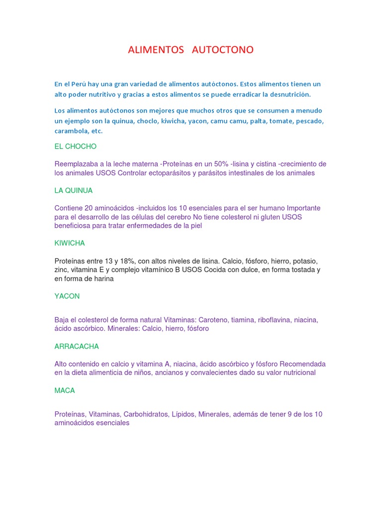 En el Per hay una gran variedad de alimentos autctonos. Estos alimentos tienen un alto poder nutritivo y gracias a estos alimentos se puede erradicar la desnutricin. Los alimentos autctonos son mejores que muchos otros que se consumen a menudo un ejemplo son la quinua, choclo, kiwicha, yacon, camu camu, palta, tomate, pescado, carambola, etc.