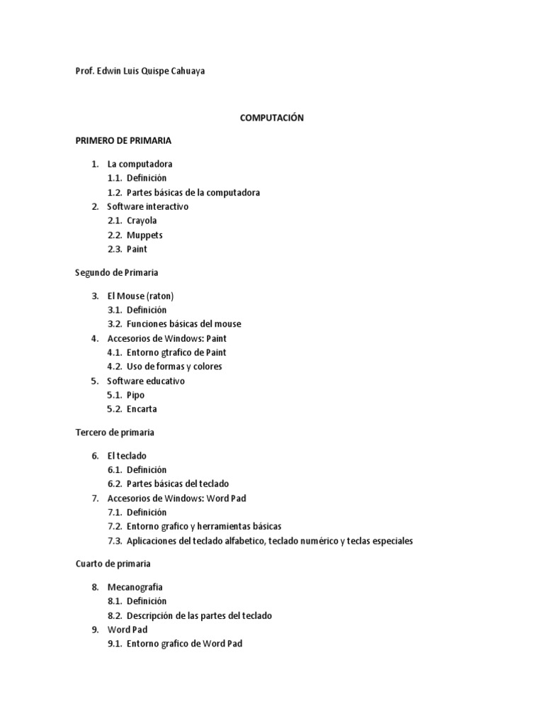 COMPUTACIN PRIMERO DE PRIMARIA 1. La computadora 1.1. Definicin 1.2. Partes bsicas de la computadora 2. Software interactivo 2.1. Crayola 2.2. Muppets 2.3. Paint Segundo de Primaria 3. El Mouse (raton) 3.1. Definicin 3.2. Funciones bsicas del mouse 4. Accesorios de Windows: Paint 4.1. Entorno gtrafico de Paint 4.2. Uso de formas y colores 5. Software educativo 5.1. Pipo 5.2. Encarta Tercero de primaria 6. El teclado 6.1. Definicin 6.2. Partes bsicas del teclado 7. Accesorios de Windows: Word Pad 7.1. Definicin 7.2. Entorno grafico y herramientas bsicas 7.3. Aplicaciones del teclado alfabetico, teclado numrico y teclas especiales Cuarto de primaria 8. Mecanografia 8.1. Definicin 8.2. Descripcin de las partes del teclado 9. Word Pad 9.1. Entorno grafico de Word Pad