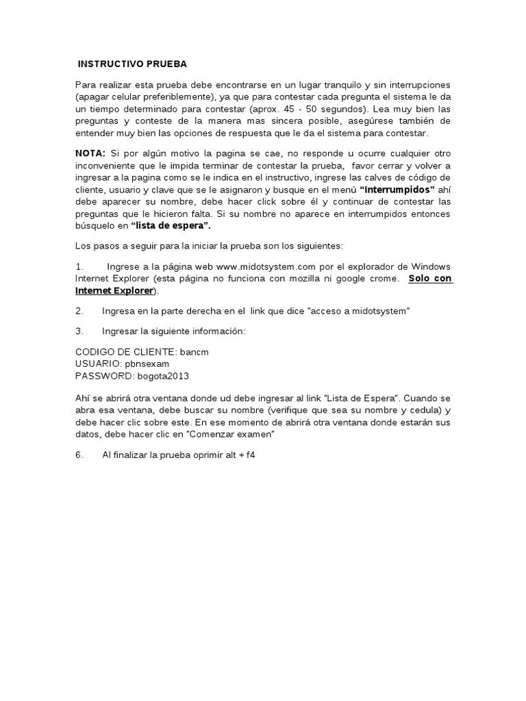 ya que para contestar cada pregunta el sistema le da un tiempo determinado para contestar (aprox. 45 - 50 segundos). ea muy bien las preguntas y conteste de la manera mas sincera posible, aseg!rese tambi"n de entender muy bien las opciones de respuesta que le da el sistema para contestar. NOTA: #i por alg!n moti$o la pagina se cae, no responde u ocurre cualquier otro incon$eniente que le impida terminar de contestar la prueba, fa$or cerrar y $ol$er a ingresar a la pagina como se le indica en el instructi$o, ingrese las cal$es de c%digo de cliente, usuario y cla$e que se le asignaron y busque en el men! Interrumpidos a&' debe aparecer su nombre, debe &acer clic( sobre "l y continuar de contestar las preguntas que le &icieron falta. #i su nombre no aparece en interrumpidos entonces b!squelo en lista de espera. os pasos a seguir para la iniciar la prueba son los siguientes) *. +ngrese a la p,gina -eb ---.[Link] por el explorador de .indo-s +nternet /xplorer (esta p,gina no funciona con mozilla ni google crome. Solo on Internet E!plorer). 0. 3. +ngresa en la parte derec&a en el lin( que dice 1acceso a midotsystem2 +ngresar la siguiente informaci%n)