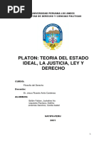 En su ascenso gradual hacia las ideas el alma debe recorrer todos los grados del ser, ascendiendo desde las imgenes hasta las ideas, pasando por los dos intermedios. (objetos fsicos y objetos matemticos). La naturaleza de los objetos matemticos Platn estaba convencido de que las matemticas no son invenciones de la mente humana, sino que existen fuera de ella y con independencia de ella. Las matemticas no tienen existencia en el mundo material, slo son copias imperfectas de lo que realmente existe en el mundo inteligible, abstracto y que slo se puede llegar a l por medio de la inteligencia. Los objetos matemticos son realidades inteligibles, eternas a semejanza de las Ideas. Los matemticos no inventan estos objetos (Triangulo, etc...) sino que los descubren por medio del pensamiento abstracto. Por esto los objetos matemticos presentan una naturaleza ideal e inteligible. Diferencias entre los objetos matemticos y las Ideas. A pesar de que los objetos matemticos son inteligibles y poseen caractersticos con las ideas, se diferencian de ellas en lo siguiente: Son realidades ontolgicamente inferiores a las Ideas pues son copias de ellas. Por ejemplo, los crculos inteligibles participan de la Idea de Circularidad. Los objetos matemticos admiten la pluralidad, mientras que cada Idea es nica, por ejemplo hay muchos crculos pero slo una Idea de circularidad. Tambin existen diferencias en lo que se refiere a la manera de conocer e investigar a unos y a otros: El matemtico estudia las entidades matemticas ayudndose de imgenes sensibles de copias materiales y visibles de esas cosas. Los filsofos, intentan conocer las ideas sin apoyarse en nada sensible, slo utilizan la inteligencia y el pensamiento abstracto. Adems los matemticos parten de hiptesis no justificadas. Son supuestos no demostrados extrados mediante razonamientos deductivos. Las matemticas no pueden considerarse como opinin, ya que no habla de cosas materiales y visibles, pero tampoco se considera conocimiento cientfico en sentido estricto, por eso recibe el nombre de pensamiento, algo intermedio entre la doxa y la episteme que tiene como objeto las Ideas. Cosmologa: el origen del mundo sensible Platn dice que la naturaleza parece apuntar hacia un orden, una armona y belleza perfectas que est ms all de ella y que no llega a cumplir. Para explicar el origen del mundo sensible y la cosmologa, ilustra el mito del Demiurgo, que ste es una inteligencia divina que orden la materia tomando como modelo las ideas, y que intent que el mundo sensible participara lo mximo posible del Ideal, pero an as es imperfecto por culpa de la materia. Antropologa, psicologa y tica Platn concibe al hombre como un compuesto de cuerpo y alma. Esto se conoce como dualismo antropolgico. 4
