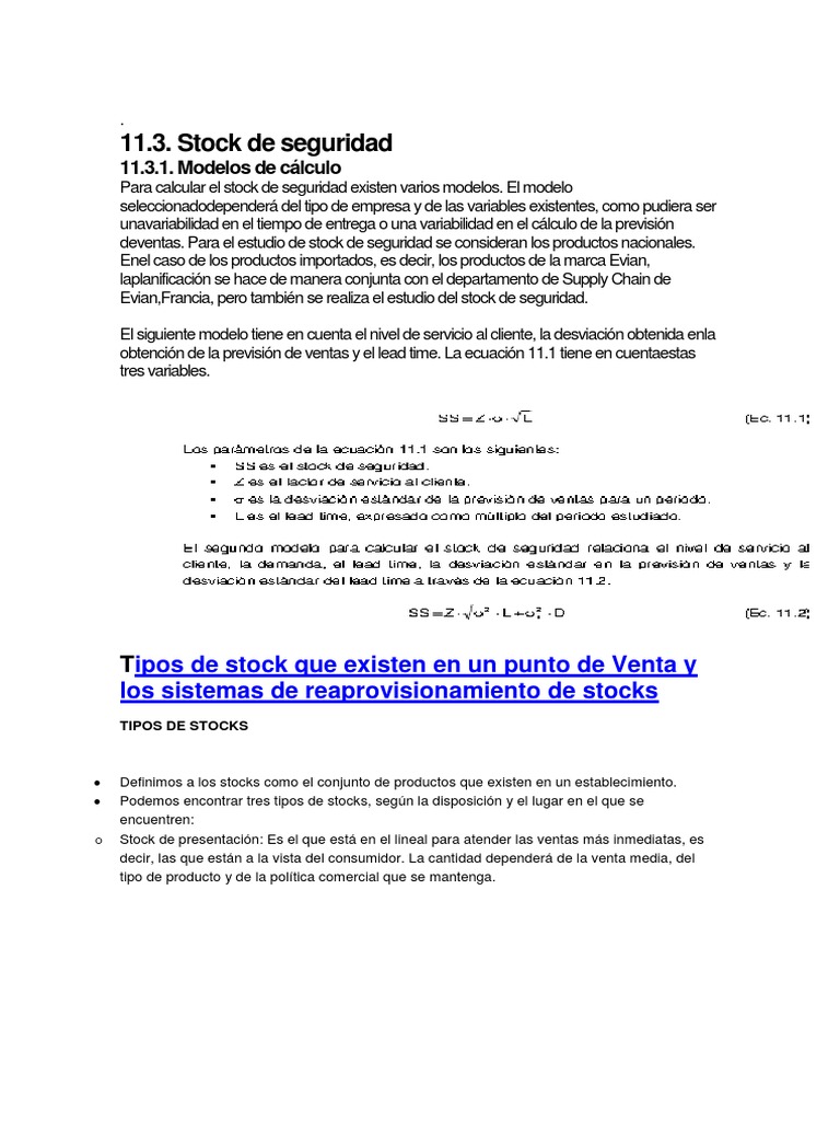 Para calcular el stock de seguridad existen varios modelos. El modelo seleccionadodepender del tipo de empresa y de las variables existentes, como pudiera ser unavariabilidad en el tiempo de entrega o una variabilidad en el clculo de la previsin deventas. Para el estudio de stock de seguridad se consideran los productos nacionales. Enel caso de los productos importados, es decir, los productos de la marca Evian, laplanificacin se hace de manera conjunta con el departamento de Supply Chain de Evian,Francia, pero tambin se realiza el estudio del stock de seguridad. El siguiente modelo tiene en cuenta el nivel de servicio al cliente, la desviacin obtenida enla obtencin de la previsin de ventas y el lead time. La ecuacin 11.1 tiene en cuentaestas tres variables.