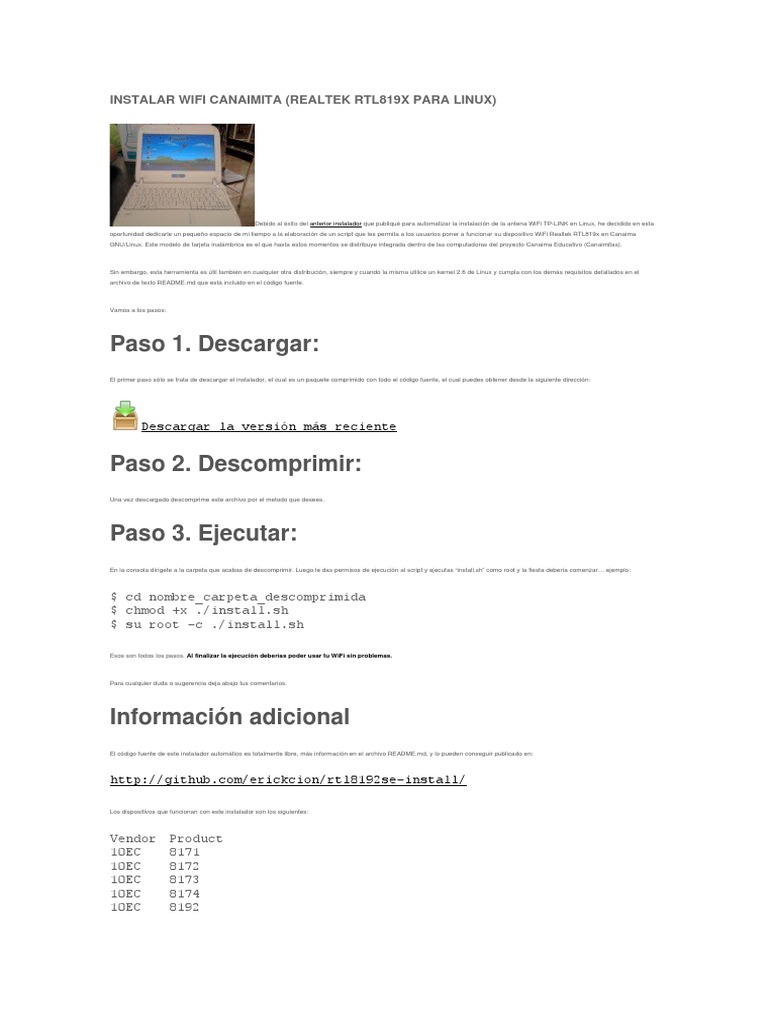 Debido al xito del anterior instalador que publiqu para automatizar la instalacin de la antena WiFi TP-LINK en Linux, he decidido en esta oportunidad dedicarle un pequeo espacio de mi tiempo a la elaboracin de un script que les permita a los usuarios poner a funcionar su dispositivo WiFi Realtek RTL819x en Canaima GNU/Linux. Este modelo de tarjeta inalmbrica es el que hasta estos momentos se distribuye integrada dentro de las computadoras del proyecto Canaima Educativo (Canaimitas).