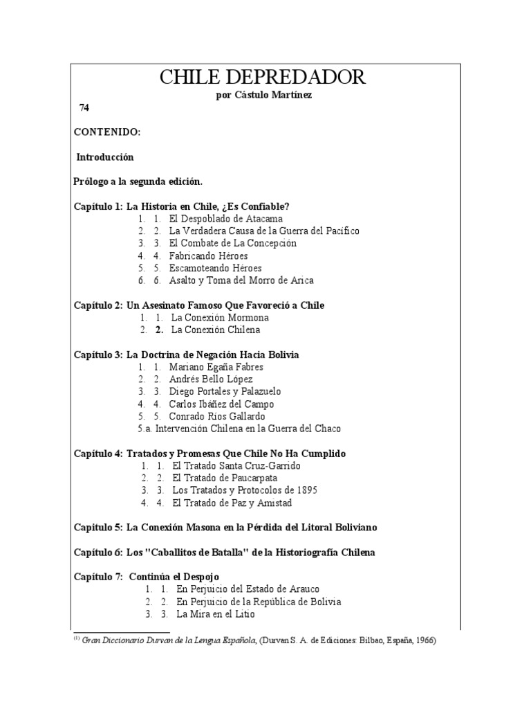 por Cstulo Martnez 74 CONTENIDO: Introduccin Prlogo a la segunda edicin Captulo !: "a #istoria en C$ile% &Es Con'ia(le) 1. 1. El Despoblado de Atacama 2. 2. La Verdadera Causa de la Guerra del Pacf co !. !. El Combate de La Co"cepc #" $. $. %abr ca"do H&roes '. '. Escamotea"do H&roes (. (. Asalto ) *oma del +orro de Ar ca Captulo *: +n ,sesinato -a.oso /ue -a0oreci a C$ile 1. 1. La Co"e, #" +ormo"a 2. * La Co"e, #" C- le"a Captulo 1: "a Doctrina de Negacin #acia 2oli0ia 1. 1. +ar a"o E.a/a %abres 2. 2. A"dr&s 0ello L#pe1 !. !. D e.o Portales ) Pala1uelo $. $. Carlos Ib2/e1 del Campo '. '. Co"rado Ros Gallardo '.a. I"ter3e"c #" C- le"a e" la Guerra del C-aco Captulo 4: Tratados 3 Pro.esas /ue C$ile No #a Cu.plido 1. 1. El *ratado 4a"ta Cru15Garr do 2. 2. El *ratado de Paucarpata !. !. Los *ratados ) Protocolos de 167' $. $. El *ratado de Pa1 ) Am stad Capitulo 4: "a Cone5in Masona en la P6rdida del "itoral 2oli0iano Captulo 7: "os 8Ca(allitos de 2atalla8 de la #istoriogra'a C$ilena Captulo 7: Contin9a el Despo:o 1. 1. E" Per8u c o del Estado de Arauco 2. 2. E" Per8u c o de la Rep9bl ca de 0ol 3 a !. !. La + ra e" el L t o