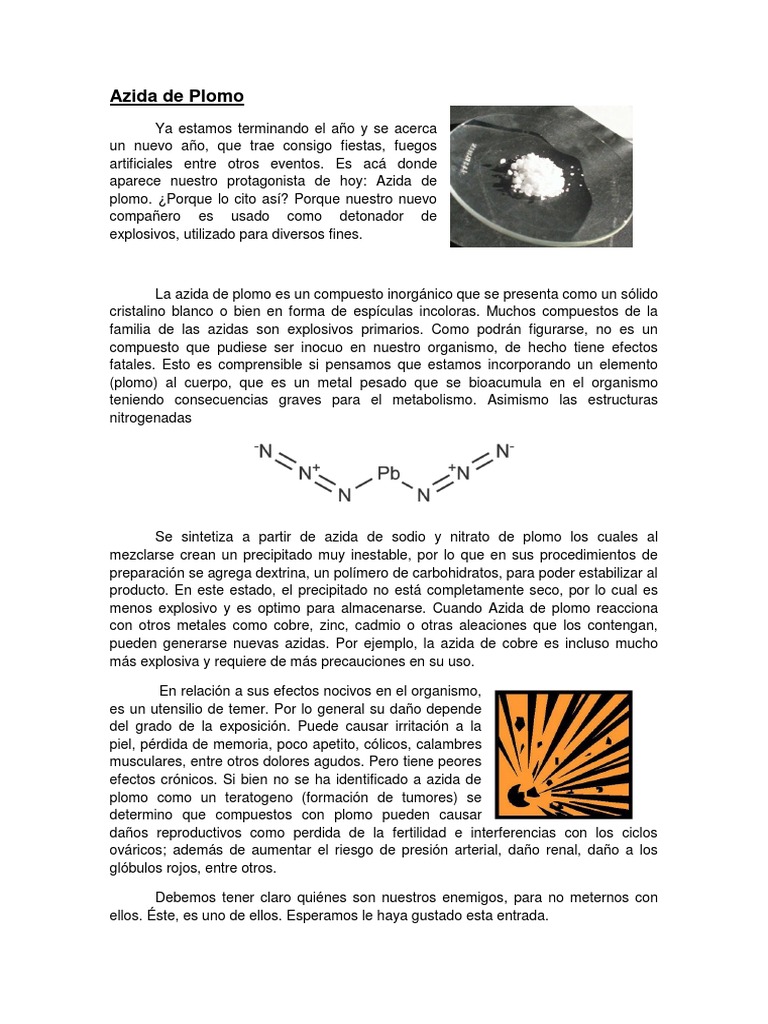 La azida de plomo es un compuesto inorgnico que se presenta como un slido cristalino blanco o bien en forma de espculas incoloras. Muchos compuestos de la familia de las azidas son explosivos primarios. Como podrn figurarse, no es un compuesto que pudiese ser inocuo en nuestro organismo, de hecho tiene efectos fatales. Esto es comprensible si pensamos que estamos incorporando un elemento (plomo) al cuerpo, que es un metal pesado que se bioacumula en el organismo teniendo consecuencias graves para el metabolismo. Asimismo las estructuras nitrogenadas