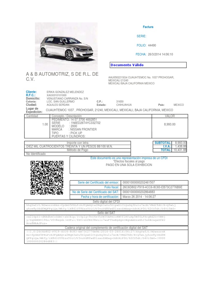 CUAUHTEMOC 1037 , PROHOGAR, 21240, MEXICALI, MEXICALI, BAJA CALIFORNIA, MEXICO Concepto / Descripcin PEDIMENTO: 14 07 3700 4002851 SERIE : 1N6ED26T4YC332702 MODELO : 2000 MARCA : NISSAN FRONTIER TIPO : PICK UP PUERTAS Y CILINDROS: VALOR 8,993.00