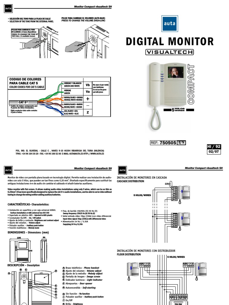 Video monitor with flat screen. It allows making audio-video installations using only 5 wires, which can be as thin as