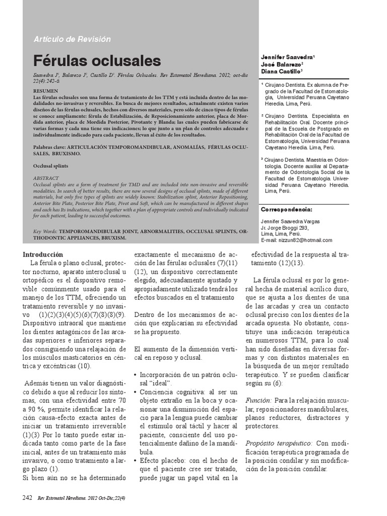 nual prctico de oclusin dentaria. Amolca; 2006. 7. Glaros AG, Owais Z, Lausten L. Reduction in parafunctional activity: a potential mechanism for the effectiveness of splint therapy. J Oral Rehabil. 2007 Feb;34(2):97-104. 8. Conti PCR, dos Santos CN, Kogawa EM, de Castro Ferreira Conti AC, de Araujo C dos RP. The treatment of painful temporomandibular joint clicking with oral splints: a randomized clinical trial. J Am Dent Assoc 1939. 2006 Aug;137(8):110814. 9. DuPont JS Jr, Brown CE. Occlusal splints from the beginning to the present. Cranio J Craniomandib Pr. 2006 Apr;24(2):1415. 10. Loza D, Millares W, Aguilar J. Procedimientos Clinicos y de Laboratorio en Oclusion Dental UPCH. Universidad Peruana Cayetano Heredia; 2001. 11. Truelove E, Huggins KH, Mancl L, Dworkin SF. The efficacy of traditional, low-cost and nonsplint therapies for temporomandibular disorder: a randomized controlled trial. J Am Dent Assoc 1939. 2006Aug;137(8):1099 1107; quiz 1169. 12. Nilsson H, Limchaichana N, Nilner M, Ekberg EC. Shortterm treatment of a resilient appliance in TMD pain patients: a randomized controlled trial. J Oral Rehabil. 2009 Aug;36(8):547-55. 13. Abekura H, Yokomura M, Sadamori S, Hamada T. The initial effects of occlusal splint vertical thickness on the nocturnal EMG activities of masticatory muscles in subjects with a bruxism habit. Int J Prosthodont. 2008 Apr;21(2):116-20. 14. Dawson PE. Evaluacin, diag245