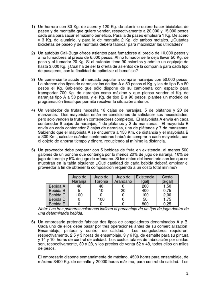 de aluminio quiere hacer bicicletas de paseo y de montaa que quiere vender, respectivamente a 20.000 y 15.000 pesos cada una para sacar el mximo beneficio. Para la de paseo emplear 1 Kg. De acero y 3 Kg. de aluminio, y para la de montaa 2 Kg. de ambos metales. Cuntas bicicletas de paseo y de montaa deber fabricar para maximizar las utilidades? 2) Un autobs Cali-Buga ofrece asientos para fumadores al precio de 10.000 pesos y a no fumadores al precio de 6.000 pesos. Al no fumador se le deja llevar 50 Kg. de peso y al fumador 20 Kg. Si el autobs tiene 90 asientos y admite un equipaje de hasta 3.000 Kg. Cul ha de ser la oferta de asientos de la compaa para cada tipo de pasajeros, con la finalidad de optimizar el beneficio? 3) Un comerciante acude al mercado popular a comprar naranjas con 50.000 pesos. Le ofrecen dos tipos de naranjas: las de tipo A a 50 pesos el Kg. y las de tipo B a 80 pesos el Kg. Sabiendo que slo dispone de su camioneta con espacio para transportar 700 Kg. de naranjas como mximo y que piensa vender el Kg. de naranjas tipo A a 58 pesos. y el Kg. de tipo B a 90 pesos. plantee un modelo de programacin lineal que permita resolver la situacin anterior. 4) Un vendedor de frutas necesita 16 cajas de naranjas, 5 de pltanos y 20 de manzanas. Dos mayoristas estn en condiciones de satisfacer sus necesidades, pero solo venden la fruta en contenedores completos. El mayorista A enva en cada contenedor 8 cajas de naranjas, 1 de pltanos y 2 de manzanas. El mayorista B enva en cada contenedor 2 cajas de naranjas, una de pltanos y 7 de manzanas. Sabiendo que el mayorista A se encuentra a 150 Km. de distancia y el mayorista B a 300 Km., calcular cuntos contenedores habr de comprar a cada mayorista, con el objeto de ahorrar tiempo y dinero, reduciendo al mnimo la distancia. 5) Un proveedor debe preparar con 5 bebidas de fruta en existencia, al menos 500 galones de un ponche que contenga por lo menos 20% de jugo de naranja, 10% de jugo de toronja y 5% de jugo de arndano. Si los datos del inventario son los que se muestran en la tabla siguiente Qu cantidad de cada bebida deber emplear el proveedor a fin de obtener la composicin requerida a un costo total mnimo? Jugo de Jugo de Jugo de Existencia Costo Naranja Toronja Arndano [gal] [$/gal] Bebida A 40 40 0 200 1,50 Bebida B 5 10 20 400 0,75 Bebida C 100 0 0 100 2,00 Bebida D 0 100 0 50 1,75 Bebida E 0 0 0 800 0,25 Nota: Las tres primeras columnas indican el porcentaje de un tipo de jugo dentro de una determinada bebida. 6) Un empresario pretende fabricar dos tipos de congeladores denominados A y B. Cada uno de ellos debe pasar por tres operaciones antes de su comercializacin: Ensamblaje, pintura y control de calidad. Los congeladores requieren, respectivamente, 2,5 y 3 horas de ensamblaje, 3 y 6 Kg. de esmalte para su pintura y 14 y 10 horas de control de calidad. Los costos totales de fabricacin por unidad son, respectivamente, 30 y 28, y los precios de venta 52 y 48, todos ellos en miles de pesos. El empresario dispone semanalmente de mximo, 4500 horas para ensamblaje, de mximo 8400 Kg. de esmalte y 20000 horas mximo, para control de calidad. Los