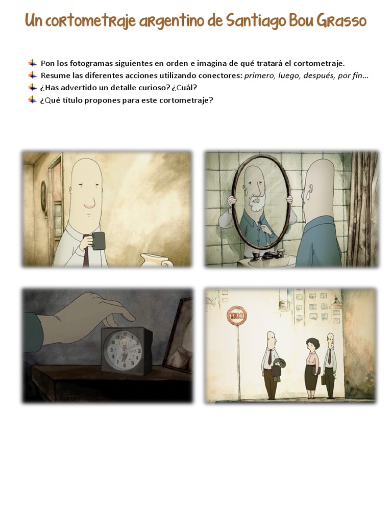 Pon los fotogramas siguientes en orden e imagina de qu tratar el cortometraje. Resume las diferentes acciones utilizando conectores: primero, luego, despus, por fin Has advertido un detalle curioso? Cul? Qu ttulo propones para este cortometraje?