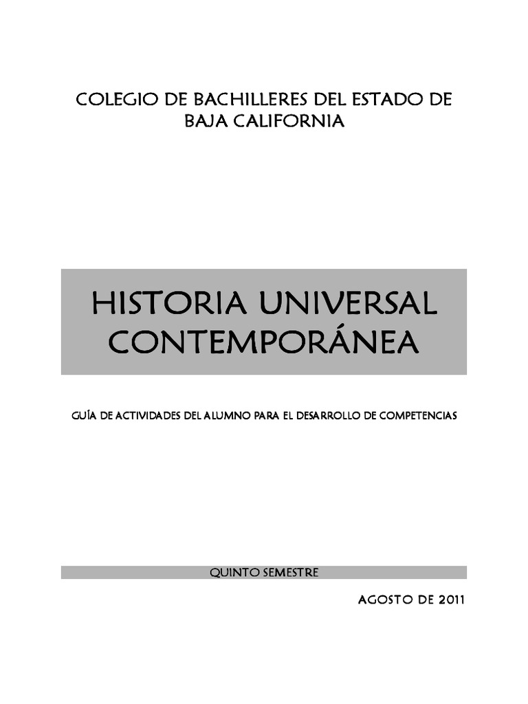 Bonilla Vzquez, Francisco Javier Historia Universal Contempornea CBBC, Mexicali B.C., 2008 Brom, Juan Esbozo de Historia Universal Ed. Grijalbo. Mxico, 2007 Harrison John, Sullivan Richard, Sherman Dennis Estudio de las Civilizaciones Occidentales McGraw-Hill. Mxico, 2003 Morales Rendn, Ana Mara y Rodrguez Cabrera, Yenisey Historia Universal Contempornea (Basado en Competencias) Ed. Progreso. Giudice, Danilo Antn Historia Universal Contempornea Ed. ST. Mxico D.F., 2008 Gmez Navarro, Jos L. et.al. Historia Universal Ed Pearson. Mxico D.F., 1998 Lamoneda Huerta Mireya y Ribo Bogara Mara Eulalia Historia Universal Ed Prentice Hall. Mxico D.F., 2002 Pastor, Marialba Historia Universal Contempornea Ed. Santillana Bachillerato, Mxico D.F., 2009