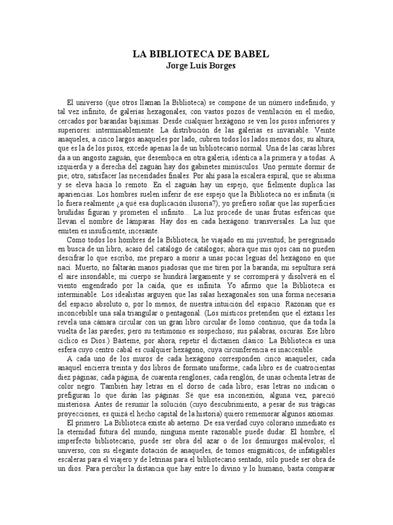 El universo (que otros llaman la Biblioteca) se compone de un nmero indefinido, y tal vez infinito, de galeras hexagonales, con vastos pozos de ventilacin en el medio, cercados por barandas bajsimas. Desde cualquier hexgono se ven los pisos inferiores y superiores: interminablemente. La distribucin de las galeras es invariable. Veinte anaqueles, a cinco largos anaqueles por lado, cubren todos los lados menos dos; su altura, que es la de los pisos, excede apenas la de un bibliotecario normal. Una de las caras libres da a un angosto zagun, que desemboca en otra galera, idntica a la primera y a todas. A izquierda y a derecha del zagun hay dos gabinetes minsculos. Uno permite dormir de pie; otro, satisfacer las necesidades finales. Por ah pasa la escalera espiral, que se abisma y se eleva hacia lo remoto. En el zagun hay un espejo, que fielmente duplica las apariencias. Los hombres suelen inferir de ese espejo que la Biblioteca no es infinita (si lo fuera realmente a qu esa duplicacin ilusoria?); yo prefiero soar que las superficies bruidas figuran y prometen el infinito... La luz procede de unas frutas esfricas que llevan el nombre de lmparas. Hay dos en cada hexgono: transversales. La luz que emiten es insuficiente, incesante. Como todos los hombres de la Biblioteca, he viajado en mi juventud; he peregrinado en busca de un libro, acaso del catlogo de catlogos; ahora que mis ojos casi no pueden descifrar lo que escribo, me preparo a morir a unas pocas leguas del hexgono en que nac. Muerto, no faltarn manos piadosas que me tiren por la baranda; mi sepultura ser el aire insondable; mi cuerpo se hundir largamente y se corromper y disolver en el viento engendrado por la cada, que es infinita. Yo afirmo que la Biblioteca es interminable. Los idealistas arguyen que las salas hexagonales son una forma necesaria del espacio absoluto o, por lo menos, de nuestra intuicin del espacio. Razonan que es inconcebible una sala triangular o pentagonal. (Los msticos pretenden que el xtasis les revela una cmara circular con un gran libro circular de lomo continuo, que da toda la vuelta de las paredes; pero su testimonio es sospechoso; sus palabras, oscuras. Ese libro cclico es Dios.) Bsteme, por ahora, repetir el dictamen clsico: La Biblioteca es una esfera cuyo centro cabal es cualquier hexgono, cuya circunferencia es inaccesible. A cada uno de los muros de cada hexgono corresponden cinco anaqueles; cada anaquel encierra treinta y dos libros de formato uniforme; cada libro es de cuatrocientas diez pginas; cada pgina, de cuarenta renglones; cada rengln, de unas ochenta letras de color negro. Tambin hay letras en el dorso de cada libro; esas letras no indican o prefiguran lo que dirn las pginas. S que esa inconexin, alguna vez, pareci misteriosa. Antes de resumir la solucin (cuyo descubrimiento, a pesar de sus trgicas proyecciones, es quiz el hecho capital de la historia) quiero rememorar algunos axiomas. El primero: La Biblioteca existe ab aeterno. De esa verdad cuyo colorario inmediato es la eternidad futura del mundo, ninguna mente razonable puede dudar. El hombre, el imperfecto bibliotecario, puede ser obra del azar o de los demiurgos malvolos; el universo, con su elegante dotacin de anaqueles, de tomos enigmticos, de infatigables escaleras para el viajero y de letrinas para el bibliotecario sentado, slo puede ser obra de un dios. Para percibir la distancia que hay entre lo divino y lo humano, basta comparar
