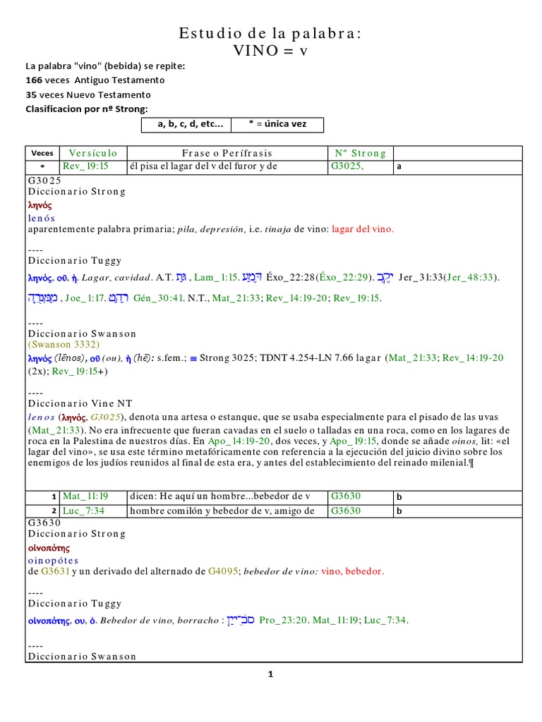 La palabra "vino" (bebida) se repite: 166 veces Antiguo Testamento 35 veces Nuevo Testamento Clasificacion por n Strong: a, b, c, d, etc...