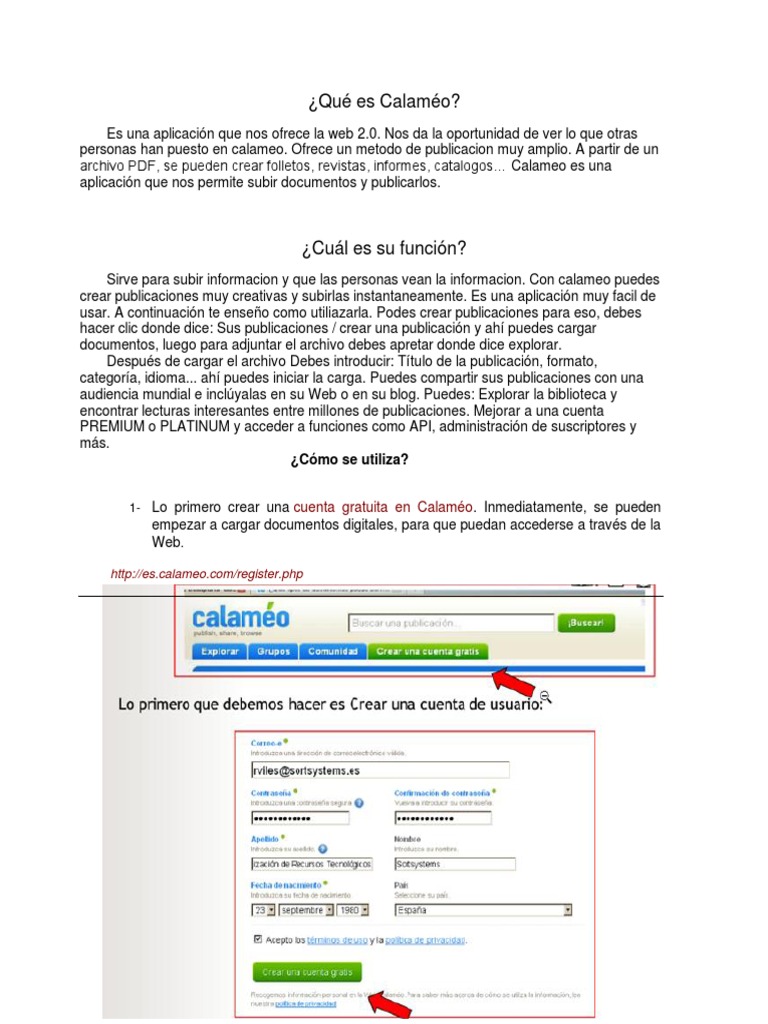 Sirve para subir informacion y que las personas vean la informacion. Con calameo puedes crear publicaciones muy creativas y subirlas instantaneamente. Es una aplicacin muy facil de usar. A continuacin te enseo como utiliazarla. Podes crear publicaciones para eso, debes hacer clic donde dice: Sus publicaciones / crear una publicacin y ah puedes cargar documentos, luego para adjuntar el archivo debes apretar donde dice explorar. Despus de cargar el archivo Debes introducir: Ttulo de la publicacin, formato, categora, idioma... ah puedes iniciar la carga. Puedes compartir sus publicaciones con una audiencia mundial e inclyalas en su Web o en su blog. Puedes: Explorar la biblioteca y encontrar lecturas interesantes entre millones de publicaciones. Mejorar a una cuenta PREMIUM o PLATINUM y acceder a funciones como API, administracin de suscriptores y ms. Cmo se utiliza?