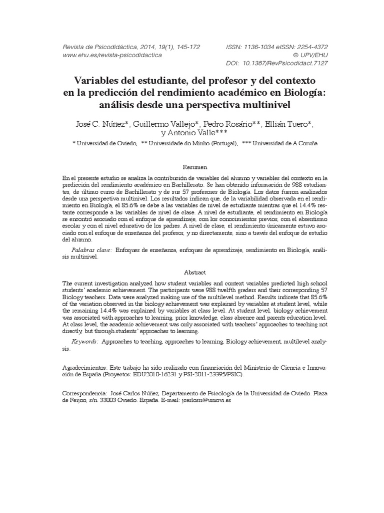 Resumen En el presente estudio se analiza la contribucin de variables del alumno y variables del contexto en la prediccin del rendimiento acadmico en Bachillerato. Se han obtenido informacin de 988 estudiantes, de ltimo curso de Bachillerato y de sus 57 profesores de Biologa. Los datos fueron analizados desde una perspectiva multinivel. Los resultados indican que, de la variabilidad observada en el rendimiento en Biologa, el 85.6% se debe a las variables de nivel de estudiante mientras que el 14.4% restante corresponde a las variables de nivel de clase. A nivel de estudiante, el rendimiento en Biologa se encontr asociado con el enfoque de aprendizaje, con los conocimientos previos, con el absentismo escolar y con el nivel educativo de los padres. A nivel de clase, el rendimiento nicamente estuvo asociado con el enfoque de enseanza del profesor, y no directamente, sino a travs del enfoque de estudio del alumno. Palabras clave: Enfoques de enseanza, enfoques de aprendizaje, rendimiento en Biologa, anlisis multinivel. Abstract The current investigation analyzed how student variables and context variables predicted high school students academic achievement. The participants were 988 twelfth graders and their corresponding 57 Biology teachers. Data were analyzed making use of the multilevel method. Results indicate that 85.6% of the variation observed in the biology achievement was explained by variables at student level, while the remaining 14.4% was explained by variables at class level. At student level, biology achievement was associated with approaches to learning, prior knowledge, class absence and parents education level. At class level, the academic achievement was only associated with teachers approaches to teaching not directly, but through students approaches to learning. Keywords: Approaches to teaching, approaches to learning, Biology achievement, multilevel analysis. Agradecimientos: Este trabajo ha sido realizado con financiacin del Ministerio de Ciencia e Innovacin de Espaa (Proyectos: EDU2010-16231 y PSI-2011-23395/PSIC). Correspondencia: Jos Carlos Nez, Departamento de Psicologa de la Universidad de Oviedo. Plaza de Feijoo, s/n. 33003 Oviedo. Espaa. E-mail: jcarlosn@[Link]