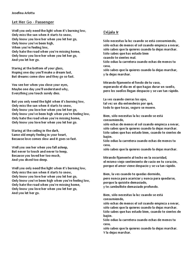 Slo necesitas la luz cuando se est consumiendo, slo echas de menos el sol cuando empieza a nevar, slo sabes que la quieres cuando la dejas marchar. Slo sabes que has estado bien cuando te sientes mal. Slo odias la carretera cuando echas de menos tu casa, slo sabes que la quieres cuando la dejas marchar, y la dejas marchar. Mirando fijamente el fondo de tu vaso, esperando el da en el que hagas durar un sueo, pero los sueos llegan despacio y se van tan rpido. La ves cuando cierras los ojos, tal vez un da entenders por qu, todo lo que tocas, seguro se muere. Bien, slo necesitas la luz cuando se est consumiendo, slo echas de menos el sol cuando empieza a nevar, slo sabes que la quieres cuando la dejas marchar. Slo sabes que has estado bien, cuando te sientes de bajn. Slo odias la carretera cuando echas de menos tu casa, slo sabes que la quieres cuando la dejas marchar. Mirando fijamente al techo en la oscuridad, el mismo viejo sentimiento de vaco en tu corazn, porque el amor viene despacio y se va tan rpido. Bien, la ves cuando te quedas dormido, pero nunca para acariciar y nunca para quedarse, porque la quisiste demasiado, y te zambulliste demasiado profundo. Bien, slo necesitas la luz cuando se est consumiendo, slo echas de menos el sol cuando empieza a nevar, slo sabes que la quieres cuando la dejas marchar. Slo sabes que has estado bien, cuando te sientes de bajn. Slo odias la carretera cuando echas de menos tu casa, slo sabes que la quieres cuando la dejas marchar. Y la dejas marchar.