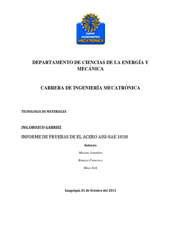 A travs de la historia el hombre ha tratado de mejorar las materias primas, aadiendo materiales tanto orgnicos como inorgnicos, para obtener los resultados ideales para las diversas construcciones. Dado el caso de que los materiales ms usados en la construccin no se encuentran en la naturaleza en estado puro, por lo que para su empleo hay que someterlos a una serie de operaciones metalrgicas cuyo fin es separar el metal de las impurezas u otros minerales que lo acompaen. Pero esto no basta para alcanzar las condiciones ptimas, entonces para que los metales tengan buenos resultados, se someten a ciertos tratamientos con el fin de hacer una aleacin que rena una serie de propiedades que los hagan aptos para adoptar sus formas futuras y ser capaces de soportar los esfuerzos a los que van a estar sometidos. En la actualidad, la vida de un ingeniero mecnico est ligada completamente al manejo de tablas y valores previamente determinados, sabiendo interpretarlos para una cierta aplicacin, pero ms all de entender, lo que pretendemos en el siguiente trabajo es verificar que el material adquirido (acero SAE- AISI 1018) cumplan con los valores asignados en dichas tablas y con esto asegurar que en verdad estamos trabajando con el material adquirido. En el primer captulo se trata el tema de los acero dando a conocer sus propiedades, aplicaciones, procesos de produccin y obtencin, materias prima, caractersticas.