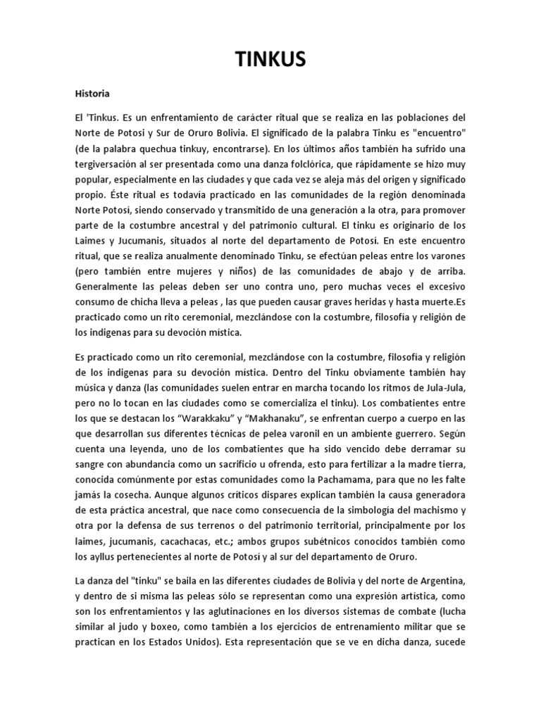 Historia El 'Tinkus. Es un enfrentamiento de carcter ritual que se realiza en las poblaciones del Norte de Potosi y Sur de Oruro Bolivia. El significado de la palabra Tinku es "encuentro" (de la palabra quechua tinkuy, encontrarse). En los ltimos aos tambin ha sufrido una tergiversacin al ser presentada como una danza folclrica, que rpidamente se hizo muy popular, especialmente en las ciudades y que cada vez se aleja ms del origen y significado propio. ste ritual es todava practicado en las comunidades de la regin denominada Norte Potos, siendo conservado y transmitido de una generacin a la otra, para promover parte de la costumbre ancestral y del patrimonio cultural. El tinku es originario de los Laimes y Jucumanis, situados al norte del departamento de Potos. En este encuentro ritual, que se realiza anualmente denominado Tinku, se efectan peleas entre los varones (pero tambin entre mujeres y nios) de las comunidades de abajo y de arriba. Generalmente las peleas deben ser uno contra uno, pero muchas veces el excesivo consumo de chicha lleva a peleas , las que pueden causar graves heridas y hasta muerte.Es practicado como un rito ceremonial, mezclndose con la costumbre, filosofa y religin de los indigenas para su devocin mstica. Es practicado como un rito ceremonial, mezclndose con la costumbre, filosofa y religin de los indigenas para su devocin mstica. Dentro del Tinku obviamente tambin hay msica y danza (las comunidades suelen entrar en marcha tocando los ritmos de Jula-Jula, pero no lo tocan en las ciudades como se comercializa el tinku). Los combatientes entre los que se destacan los Warakkaku y Makhanaku, se enfrentan cuerpo a cuerpo en las que desarrollan sus diferentes tcnicas de pelea varonil en un ambiente guerrero. Segn cuenta una leyenda, uno de los combatientes que ha sido vencido debe derramar su sangre con abundancia como un sacrificio u ofrenda, esto para fertilizar a la madre tierra, conocida comnmente por estas comunidades como la Pachamama, para que no les falte jams la cosecha. Aunque algunos crticos dispares explican tambin la causa generadora de esta prctica ancestral, que nace como consecuencia de la simbologa del machismo y otra por la defensa de sus terrenos o del patrimonio territorial, principalmente por los laimes, jucumanis, cacachacas, etc.; ambos grupos subtnicos conocidos tambin como los ayllus pertenecientes al norte de Potos y al sur del departamento de Oruro. La danza del "tinku" se baila en las diferentes ciudades de Bolivia y del norte de Argentina, y dentro de si misma las peleas slo se representan como una expresin artstica, como son los enfrentamientos y las aglutinaciones en los diversos sistemas de combate (lucha similar al judo y boxeo, como tambin a los ejercicios de entrenamiento militar que se practican en los Estados Unidos). Esta representacin que se ve en dicha danza, sucede